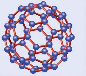 El más importante de los fullerenos es el C60, denominado así por contar con un total de sesenta átomos de carbono, los cuales forman una estructura constituida por 20 hexágonos y 20 pentágonos alternados, formando el balón de fútbol al que hice alusión. Por esta razón se le ha denominado con los informales nombres de futboleno o buckybola, aunque su nombre oficial, aparte del prosaico C60, es el de buckminsterfulereno. Otro fullereno importante es el C70, con diez átomos de carbono más y forma de balón de rugby, o de melón. También los hay más pequeños, como el C20, con doce pentágonos y forma de dodecaedro regular, y más grandes, como el C76, el C84 y el C540.