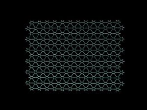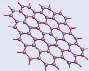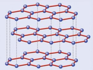 Pasemos ahora al grafito. El carbono tiene la particularidad de poder formar varios tipos de enlaces distintos, un fenómeno sobre el que no me extenderé aquí puesto que merece ser tratado en un artículo aparte. En consecuencia los átomos no se distribuyen, como en el caso anterior, en una red tridimensional tetraédrica, sino en una red hexagonal plana. Ahora cada átomo de carbono no está rodeado por cuatro átomos por arriba y por abajo, sino que cada seis de ellos forman un hexágono regular que a su vez está rodeado por otros hexágonos, creando algo parecido a un mosaico cuyas piezas son estas figuras geométricas. A su vez estas láminas se apilan entre sí formando algo que podríamos comparar con un hojaldre; es esto último a lo que llamamos grafito, ya que una lámina aislada -el grafeno del que hablaremos más adelante- es tan delgada -tiene aproximadamente el espesor de un átomo- que no ha podido ser obtenida de forma aislada sino hasta fechas muy recientes.
