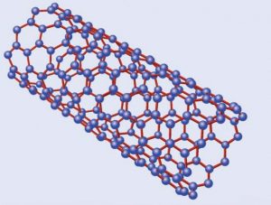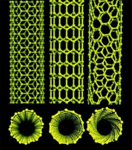 Emparentados con los fullerenos están los nanotubos de carbono, descritos por vez primera por Suomo Iijima en 1991. La estructura de ambos es similar, pero a diferencia de los fullerenos los nanotubos no forman poliedros sino, como su nombre indica, tubos de tamaño nanométrico, un millón de veces menores que un milímetro. Volviendo a nuestros símiles un nanotubo sería algo así como un barquillo, con una o varias láminas de grafeno enrolladas en forma de cilindro. Dependiendo de la manera en la que se enrollan, o del número de capas que los forman, existen diversos tipos de nanotubos, siendo los principales los nanotubos monocapa, los haces de nanotubos monocapa y los nanotubos multicapa. Los primeros están formados por una única capa, y a su vez se subdividen en varias categorías según sea la distribución geométrica de los hexágonos que la componen. Los segundos serían algo así como un haz de macarrones -crudos, evidentemente- y los terceros, por último, están formados por un conjunto de varias capas concéntricas enrolladas en torno al eje común, envolviendo cada una de ellas a todas las interiores.
