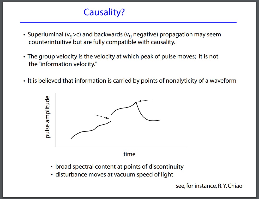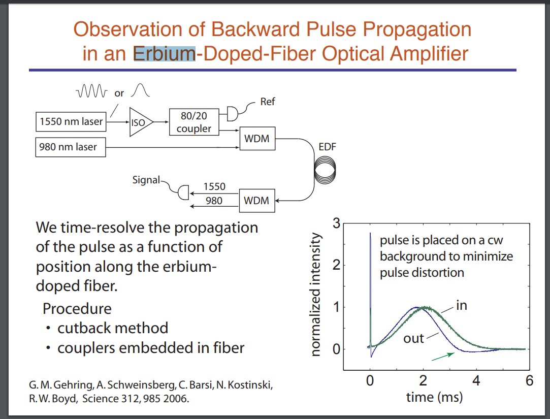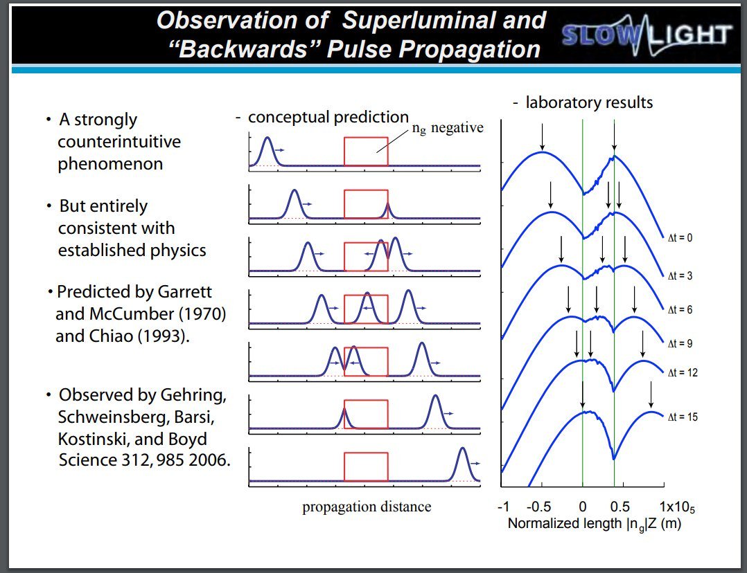 Aquí se recogen los trabajos de Robert Boyd demostrados y probados. Que demostraron que al hacer pasar un haz láser por una fibra dopada con erbio la luz sale con vector de posición negativo, y dos veces más rápida en el tiempo. Porque la luz en el vacío tiene una velocidad máxima que es común a lo que está en el espacio, pero por un medio puede viajar más rápido y con vector de dirección negativo.